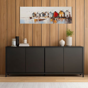 Die kunstvoll dargestellten, bunten dänische Häuser spiegeln sich malerisch im Wasser und bilden einen lebendigen Kontrast zur schlichten Eleganz des schwarzen Sideboards und der warmen Holzwand. Mit diesem Kunstwerk holen Sie sich die authentische dänische Küstenlandschaft direkt in Ihr Wohnzimmer – ein täglicher Ausblick, der an entspannte Urlaubstage im Norden erinnert.