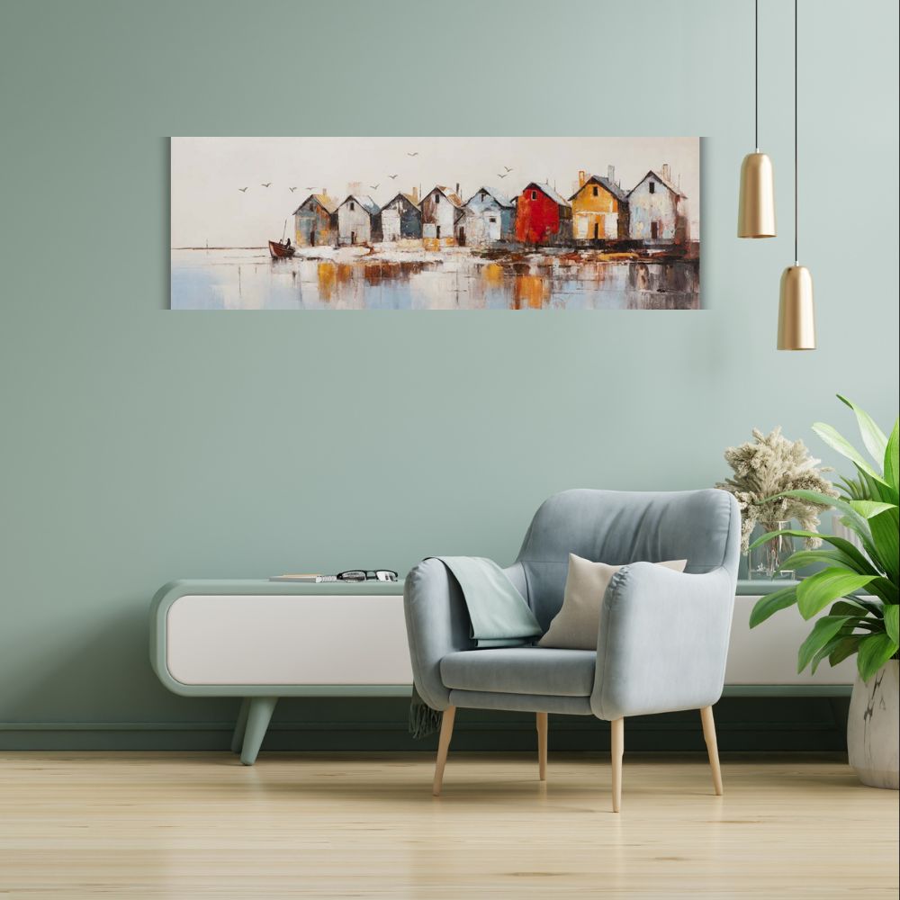 Tauche ein in die idyllische Szenerie, Lake Side Living, in der sich die Häuser im ruhigen See spiegeln und Möwen elegant über die Dächer gleiten. Ein Fischerboot setzt gerade seine Tour auf dem klaren Wasser fort, während die schönen Farben des Gemäldes dein Esszimmer oder Wohnzimmer mit Urlaubserinnerungen füllen.