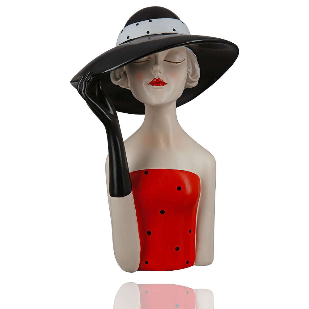 Diese Skulptur verleiht jedem Raum eine luxuriöse Note und zieht alle Blicke auf sich. Ob auf einem Sideboard, in einer Vitrine oder auf einem Beistelltisch platziert - die Lady mit schwarzem Hut und dem roten gepunkteten Oberteil strahlt Eleganz und Stil aus.