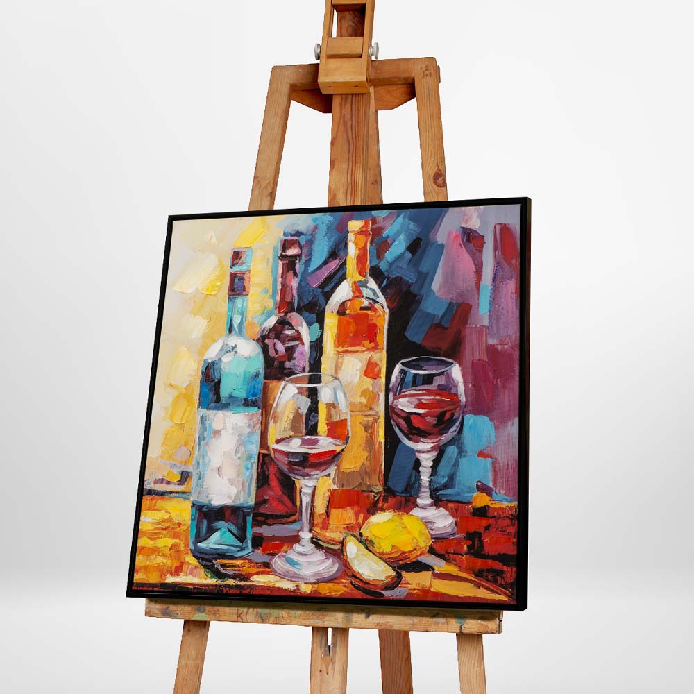Das Acryl Gemälde "Weinlaune" von ImageLand ist eine lebendige Darstellung von drei Weinflaschen und zwei mit Rotwein gefüllten Weingläsern, kunstvoll in abstrakten, farbenfrohen Strichen gemalt. Dieses Bild ist ideal für das Esszimmer und wird sicherlich die Herzen von Weinfreunden und Weingenießern höher schlagen lassen.