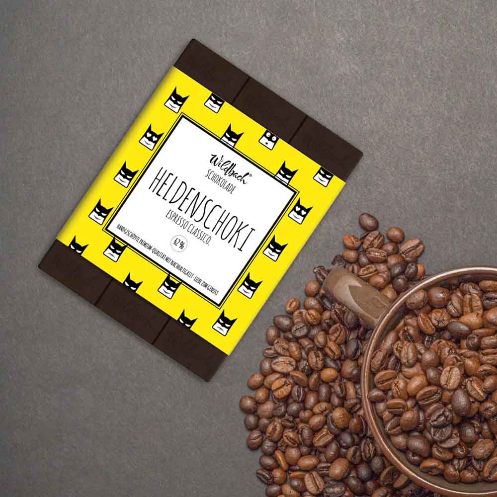 Heldenschoki, Zartbitterschokolade 62%, Espresso Classico, Tafel 70g., Wildbach