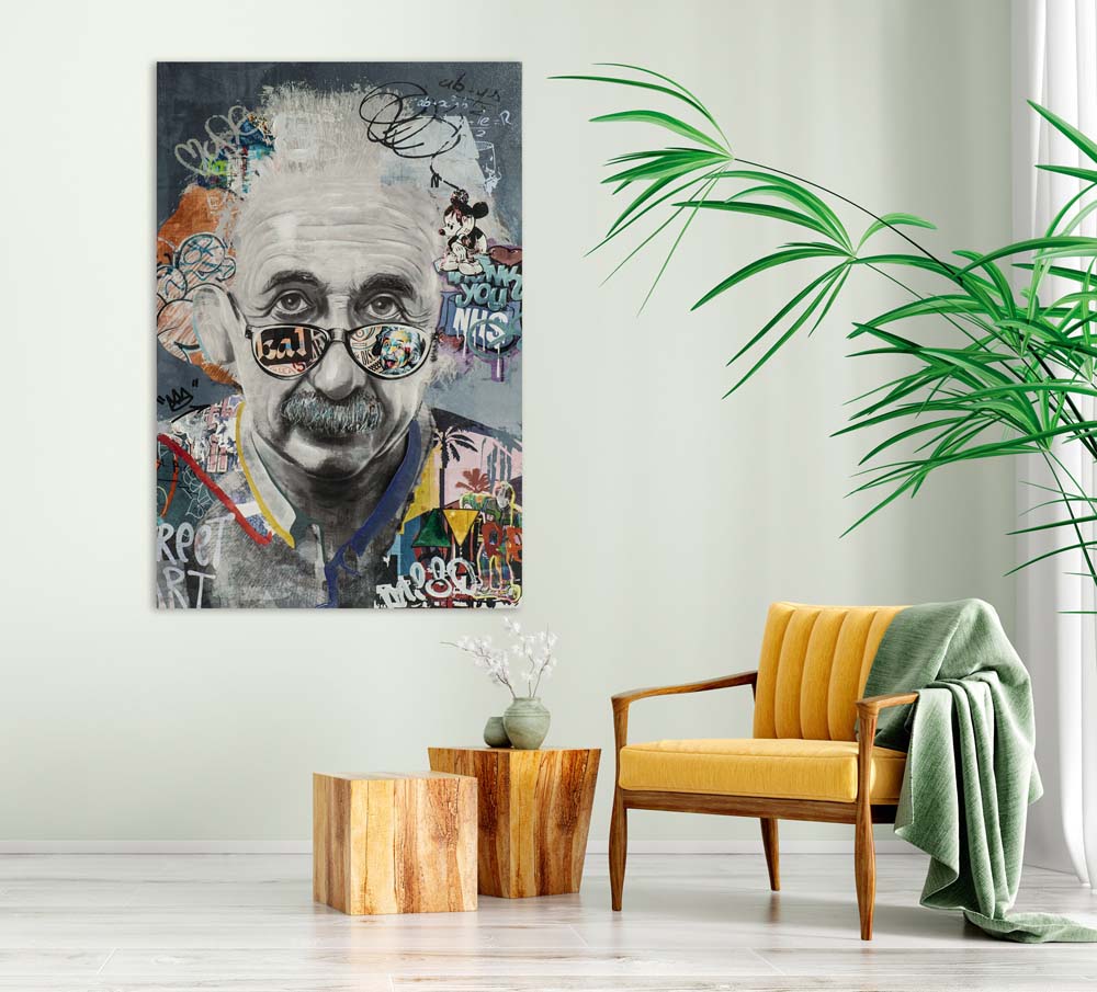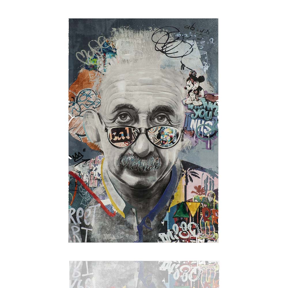 Er sieht aus wie ein verrückter Professor, aber in Wirklichkeit ist er ein Genie. Im Graffiti- oder Popartstil wurden rings um den berühmten Professor mit bunter Brille Zeichen, Wörter und eine Formel gesetzt. Dieses farbenfrohe Portrait wird ihnen und ihren Gästen viel Freude bereiten. Man kann auch gut erkennen, dass Genie und Wahnsinn dicht beieinander liegen. Ob ich damit den Professor meine, oder den Künstler, bleibt euch überlassen.