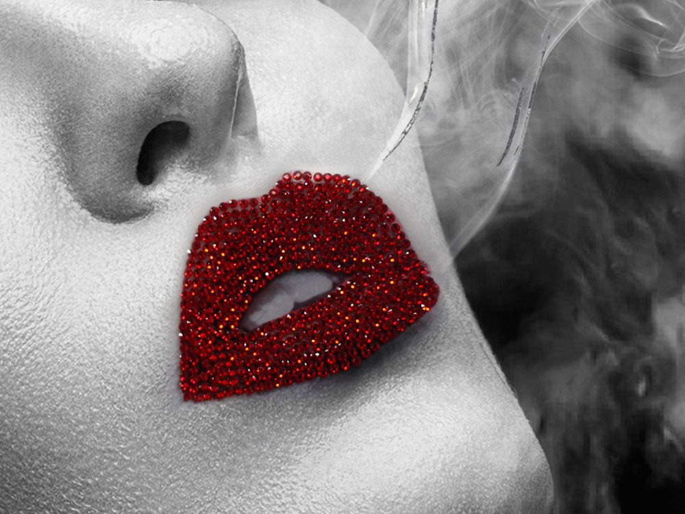 Entdecken Sie die atemberaubende Schönheit dieses ausdrucksstarken Bildes von ImageLand, "Rauchende Schönheit mit roten Lippen". Das faszinierende Porträt einer wunderschönen Frau zieht alle Blicke auf sich. Ihre roten Lippen wurden kunstvoll mit einer Glitzerfolie hervorgehoben und verleihen dem Bild eine einzigartige Ausstrahlung.