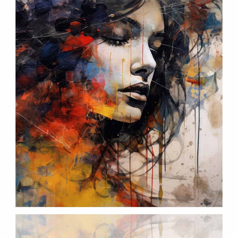Der besondere Zauber dieses Kunstwerks liegt jedoch in der faszinierenden Kombination aus realistischem Porträt und den farbenfrohen, abstrakten Akzenten, die das Bild umgeben. Lebendige Farbspritzer und Striche in warmen Rottönen, leuchtendem Gelb und kühlem Blau umrahmen das Gesicht und erzeugen einen kraftvollen Kontrast. Diese dynamische Farbexplosion vermittelt Bewegung und Emotion, die dem Bild eine traumhafte Qualität verleiht.