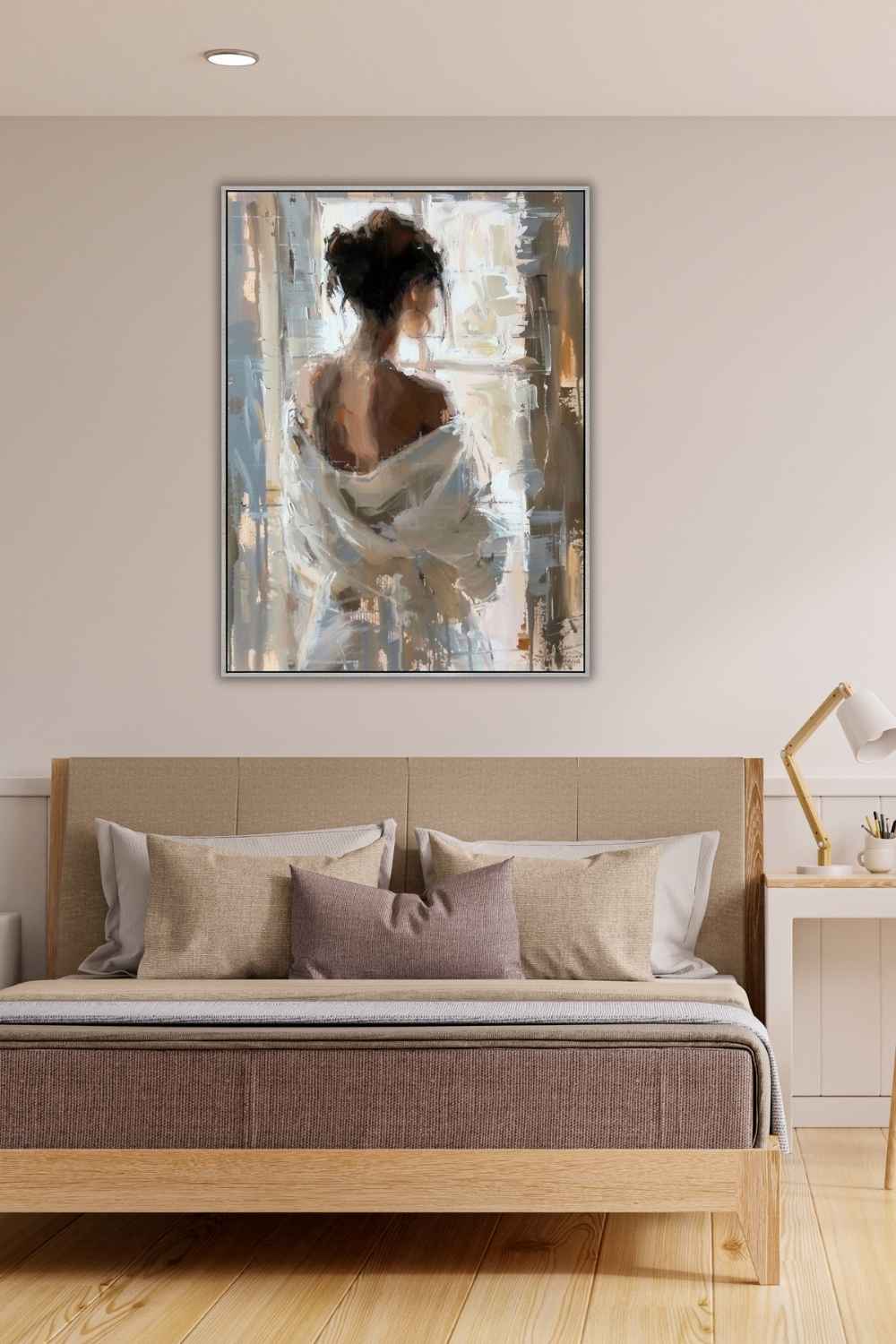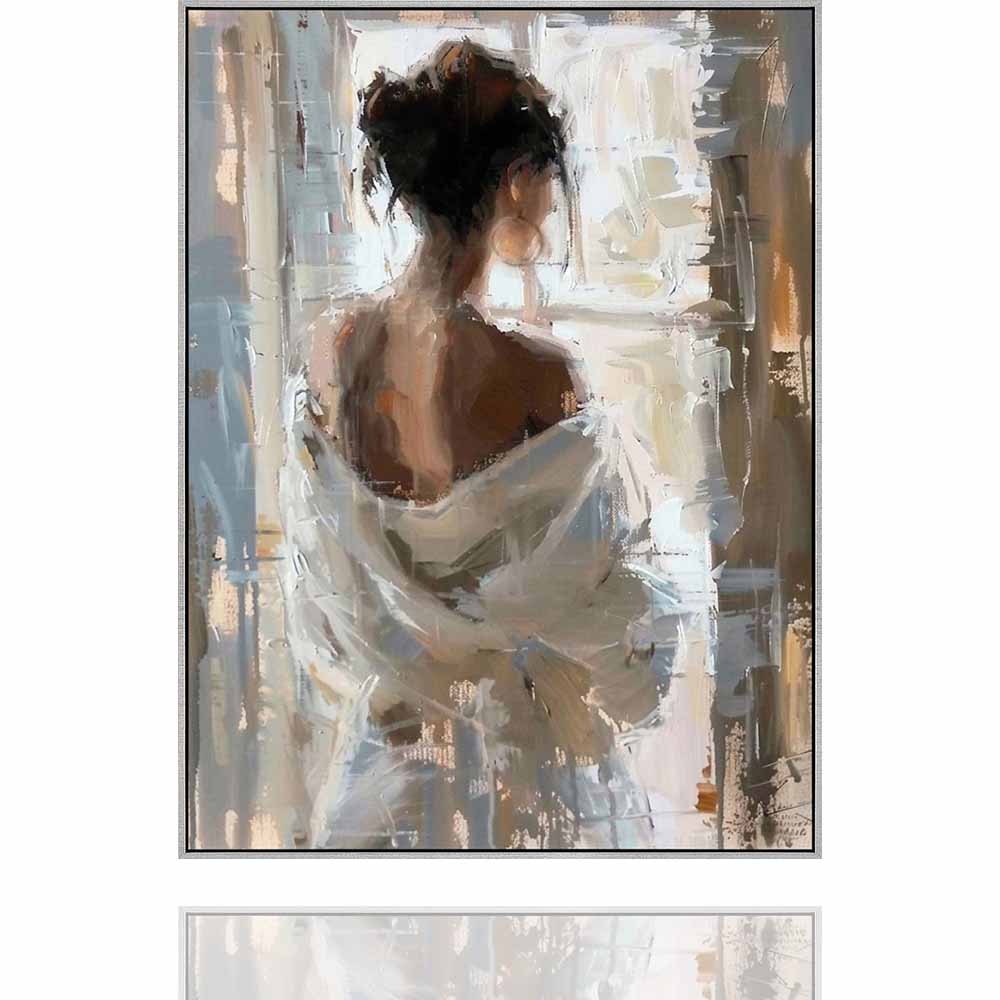 Lass Dich von der zauberhaften Ausstrahlung des handgemalten Acrylgemäldes "Schöner Rücken" verzaubern! Dieses kunstvolle Werk zeigt eine Frau, die verträumt aus dem Fenster schaut. Ihr eleganter weißer Bademantel rutscht sanft von ihren Schultern und offenbart ihren schönen Rücken, während ihre langen braunen Haare hochgesteckt sind.