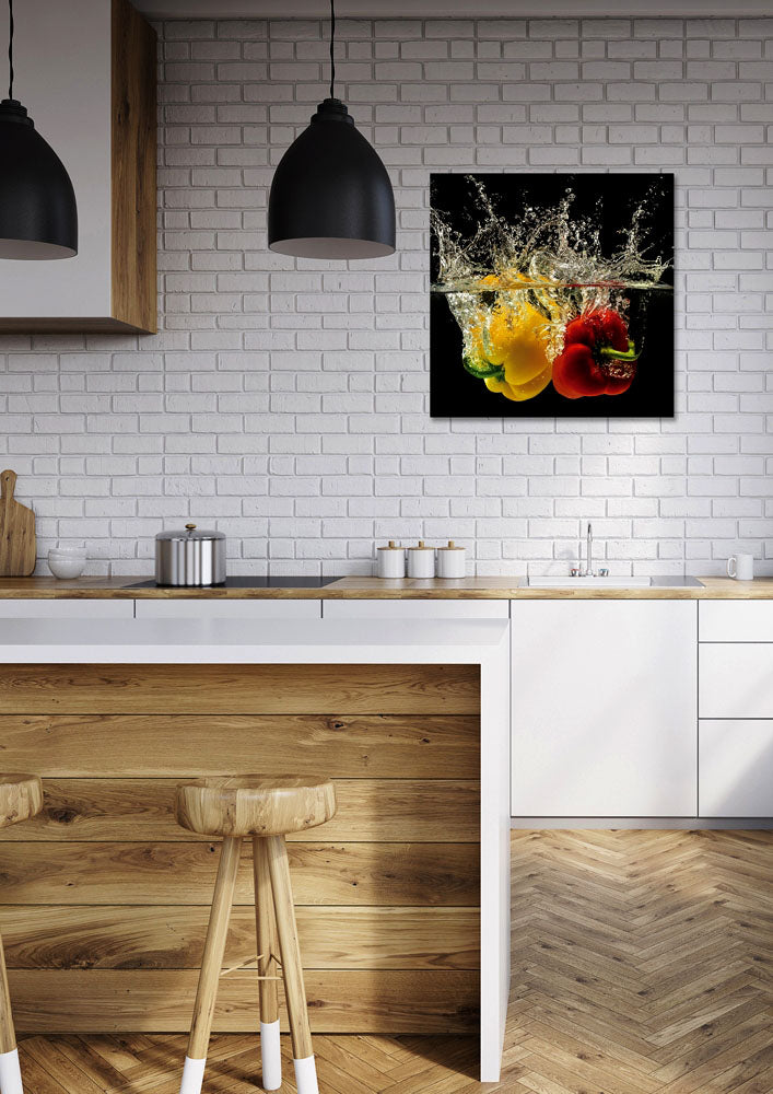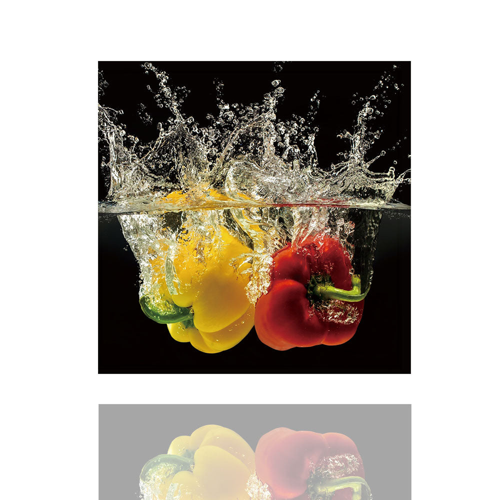 Das moderne Glasbild "Splash Paprika" von ImageLand ist ein wahres Highlight für deine Küche, dein Esszimmer oder deine Bar. Das Bild zeigt eine rote und gelbe Paprika, die in Zeitlupe ins Wasser fallen, während das spritzende Wasser Frische und Dynamik ausstrahlt.