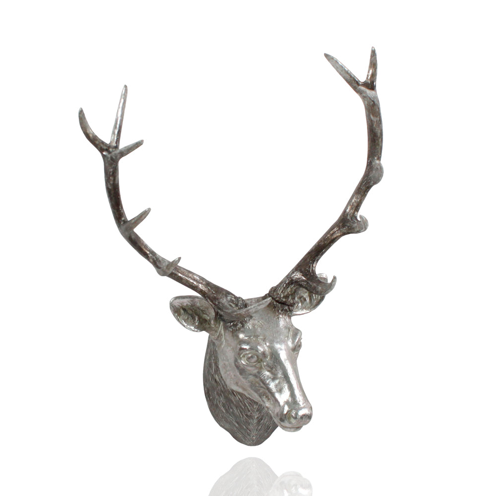 Ein Hirsch steht für Kraft und Durchsetzungsvermögen. Silberne Hirschköpfe sind als Wohnraum Deko sehr beliebt, vor allem, wenn hierfür keines dieser edlen Geschöpfe sterben musste. Dieser Hirschkopf ist keine Trophäe, sondern schicker, ausdrucksvoller Wandschmuck, der im Trend ist. Er ist in silbernem Metall-Look gefertigt. Der Hirschkopf wirkt sehr elegant und lässt sich mit vielen verschiedenen Wohnraumdekorationen kombinieren.