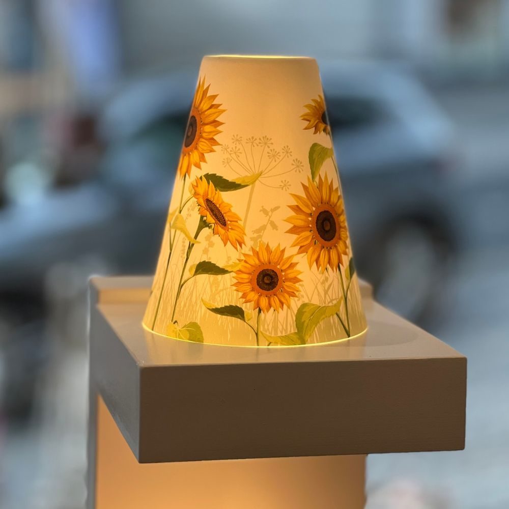 Lass den Frühling und Sommer in dein Zuhause einziehen! Das zauberhafte Windlicht, bedruckt mit kleinen und großen Sonnenblumen, bringt ein fröhliches Ambiente in jeden Raum. Das neue Design erinnert an blühende Felder und festliche Gartenpartys.