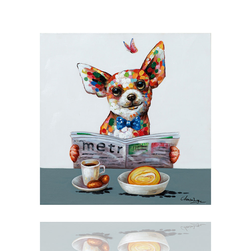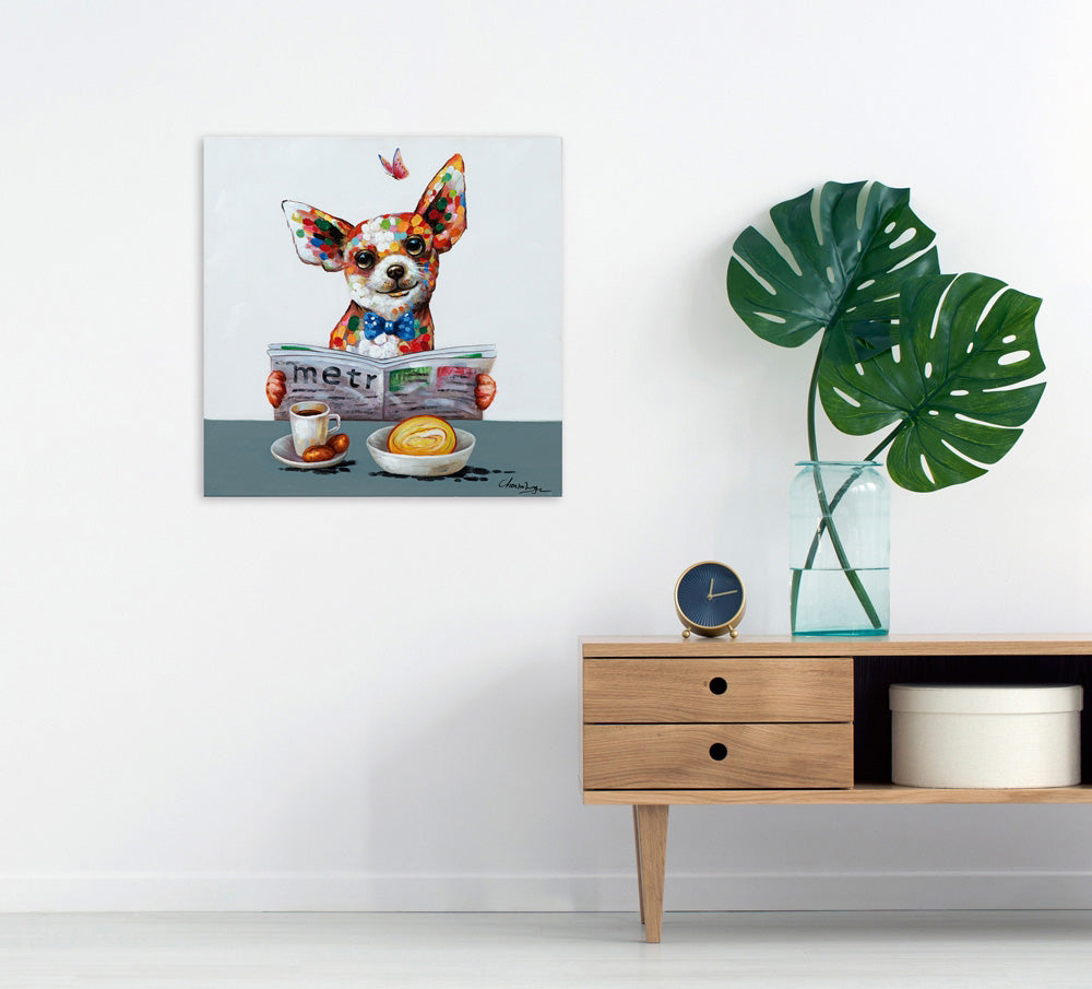 Du bist ein großer Fan von Chihuahuas und suchst nach einer Möglichkeit, deine Liebe zu deinem Lieblingshund auszudrücken? Dann ist das Acrylgemälde 'Chihuahua Hund frühstückt' von ImageLand genau das Richtige für dich! Dieses farbenfrohe Kunstwerk zeigt einen niedlichen Chihuahua, der seinen Morgenkaffee am Frühstückstisch genießt und dabei eine Zeitung liest. Das Bild ist ein wunderbarer Blickfang in jedem Raum und wird garantiert für gute Laune sorgen.