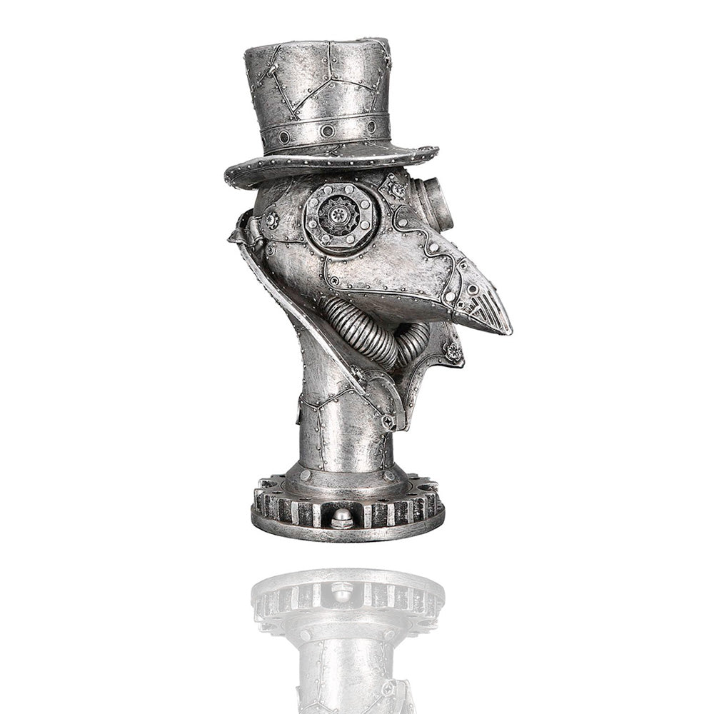 Die Steampunk Figur Krähe mit Zylinder und Brille ist typisch für Steampunk. Am Hals der Krähe befinden sich Rohre. Diese Steampunk Figur ist silberfarben und sehr beliebt.