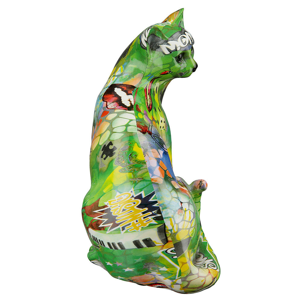 Die grüne Katze im Street Art Style ist ein echter Hingucker. Die bunte Katze ist von allen Seiten mit anderen Mustern, Blumen und Schriften bedruckt. Wer eine bunte Katzenskulptur möchte wird mit diesem Exemplar glücklich.