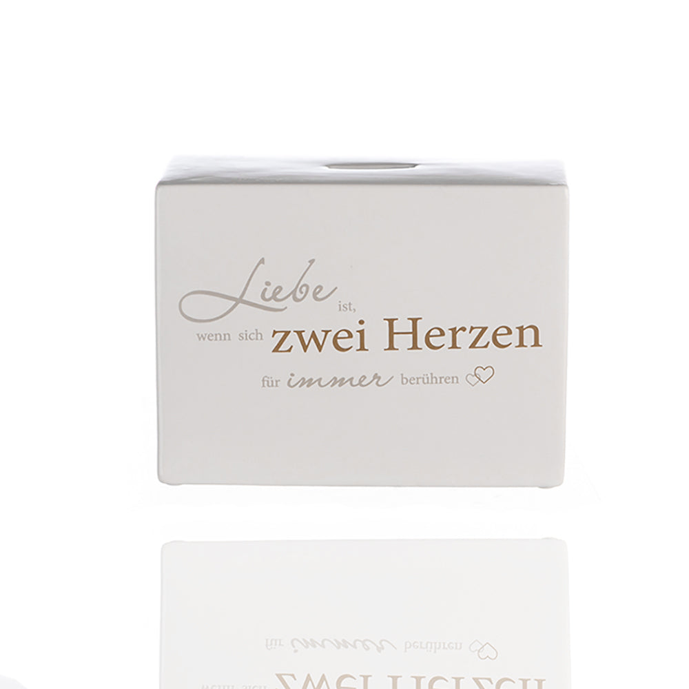 Die Spardose aus dem Hause Gilde trägt den wunderschönen Spruch „Liebe ist wenn zwei Herzen sich für immer berühren“. Die Spardose wird gerne zur kommenden Hochzeit verschenkt. Oder auch gerne an ein Liebespaar.