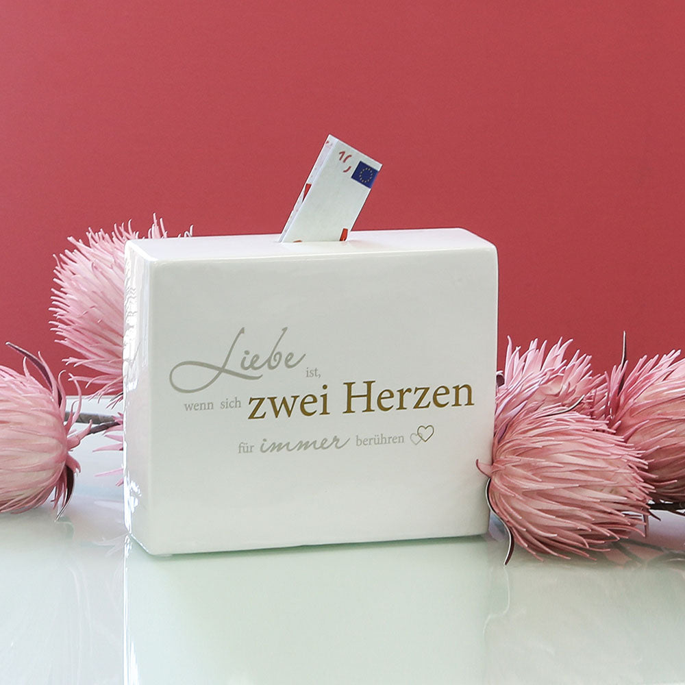 Spardose zur Hochzeit „Liebe ist wenn zwei Herzen sich für immer berühren“, Gilde