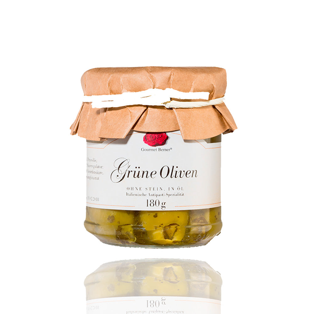 Die aromatischen grünen Oliven von Gourmet Berner sind in einer in einer würzigen Lake eingelegt.