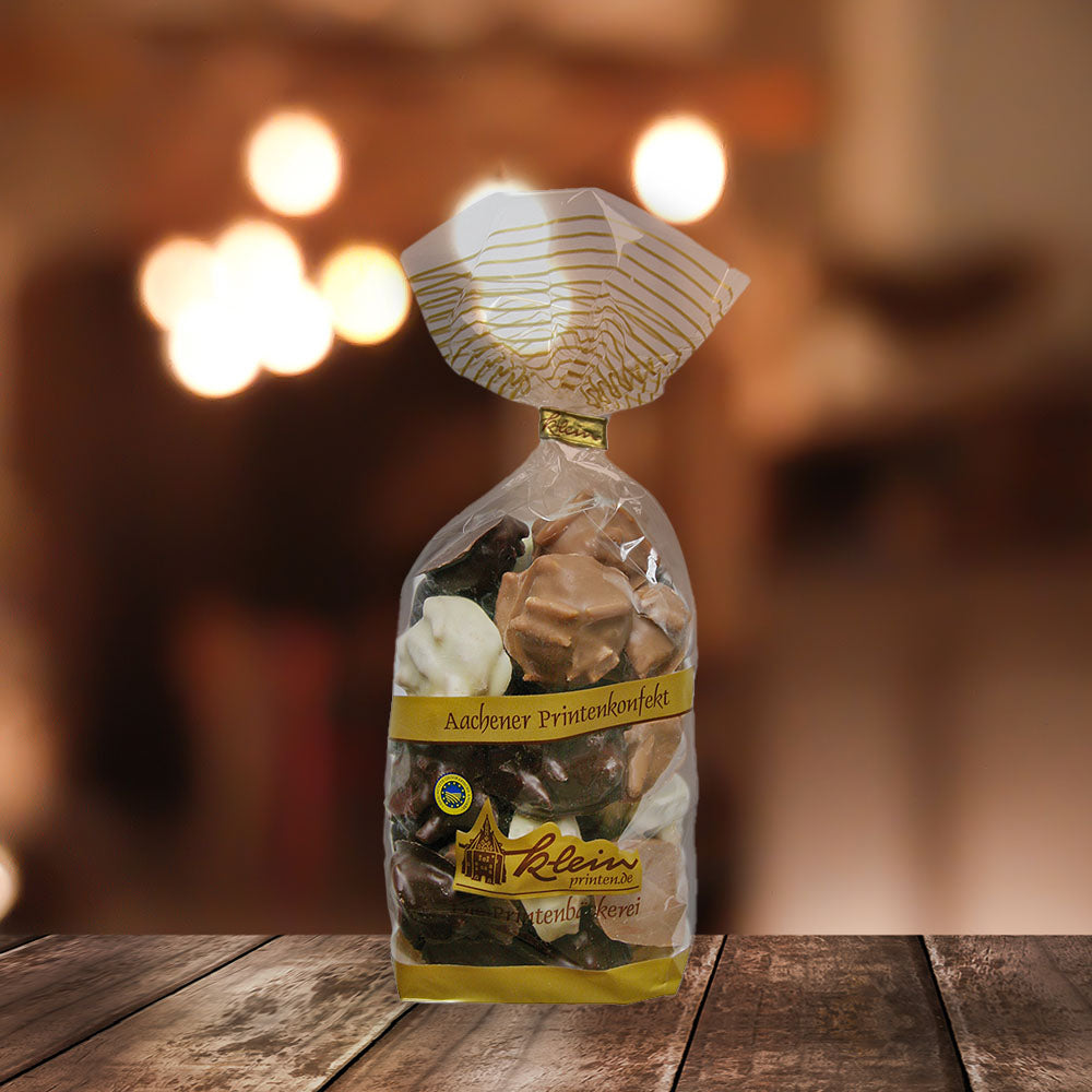 Das köstliche und unwiderstehliche Printenkonfekt von der renommierten Printenbäckerei Klein aus Aachen ist etwas für echte Feinschmecker. Mit diesem kleinen und feinen Leckerbissen wird jeder einzelne Bissen zu einem wahren Hochgenuss. Die mundgerechten Weichprinten mit Mandeln sind mit drei verschiedenen Schokoladensorten überzogen - Vollmilch, Zartbitter und Weiße Schokolade. Dieser himmlische Mix aus Geschmacksexplosionen wird dich direkt in Weihnachtsstimmung versetzen.