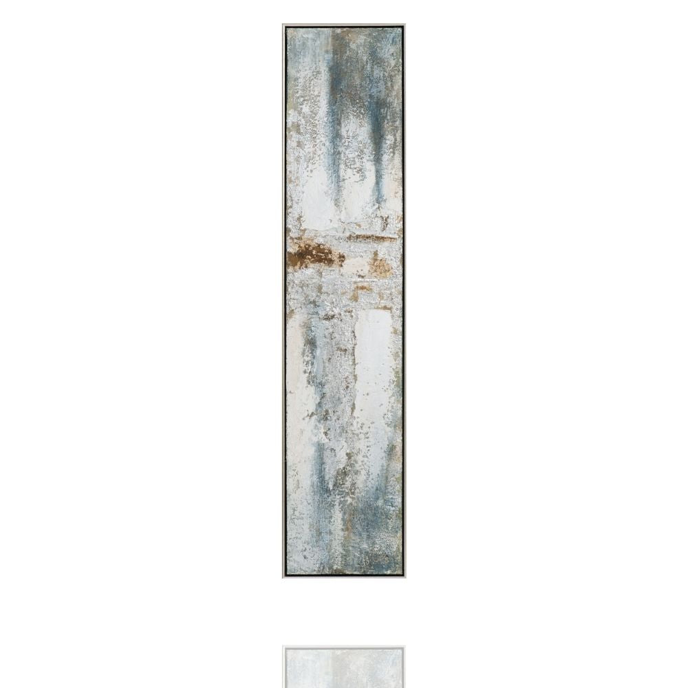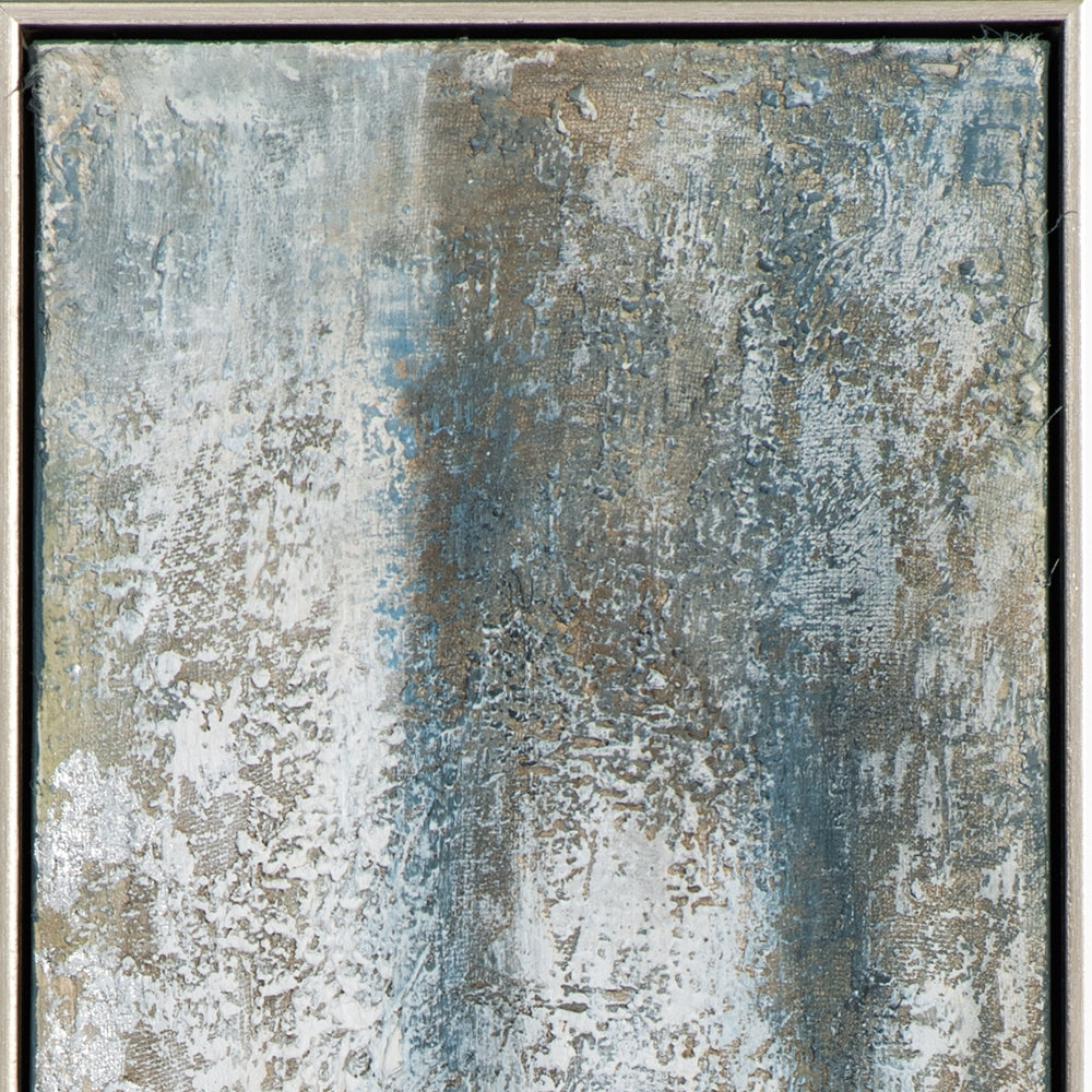 Schmales Acrylgemälde mit zarten Rahmen in den Farben Silber, Weiß und Blau.